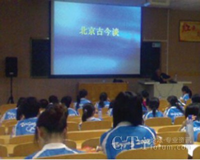 7月25日中央財(cái)經(jīng)大學(xué)的課堂里,近百位奧運(yùn)觀眾呼叫中心的志愿者聆聽了北京第二外國(guó)語(yǔ)大學(xué)西班牙語(yǔ)呂龍根教授的講座——“北京古今談”。呂教授幽默的語(yǔ)言、澎湃的激情,感染并征服了在座的每一位志愿者。教授從中國(guó)古代的六大古都(北京、西安、洛陽(yáng)、開封、南京、杭州)談到古代北京的五朝建都(遼、金、元、明、清),從北京偉大的中軸線,談到北京建筑的風(fēng)水學(xué),從北京的胡同和四合院,談到北京的著名小吃,等等等等?芍^是古今暢想、無所不談,真正讓我們領(lǐng)略了何為學(xué)者風(fēng)范。