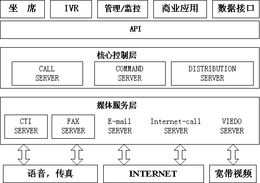 核心控制層由Call Server(呼叫控制) 、Command Server(命令服務)、Distribution Server(路由服務) 組成。Call Server用于管理呼叫信息,維護整個系統(tǒng)呼叫的狀態(tài)機;Command Server負責命令的接收和轉發(fā);Distribution Server完成路由功能。
