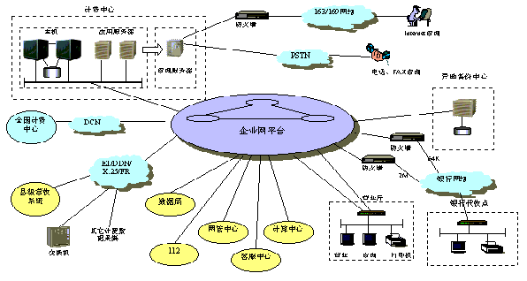 縣計費中心采用64K DDN連接各營業(yè)廳和支局,縣銀行通過銀行網絡連入企業(yè)網平臺,鄉(xiāng)鎮(zhèn)代收點視具體條件的不同可采用DDN、ISDN或PSTN方式連入計費中心。