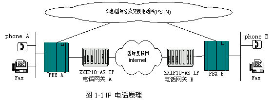 普通電話的基本流程是:用戶在phone A要打長(zhǎng)途電話到phone B,語(yǔ)音從phone A到PBX A,通過PSTN網(wǎng),經(jīng)PBX B到phone B。而IP電話的基本流程為:用戶在phone A要打長(zhǎng)途電話到phone B,語(yǔ)音經(jīng)PBX A傳到網(wǎng)關(guān)A。在網(wǎng)關(guān)A對(duì)語(yǔ)音進(jìn)行處理,打成可在IP網(wǎng)絡(luò)傳輸?shù)恼Z(yǔ)音包。由IP網(wǎng)絡(luò)將語(yǔ)音包傳給網(wǎng)關(guān)B,網(wǎng)關(guān)B對(duì)語(yǔ)音包進(jìn)行處理,還原為語(yǔ)音,經(jīng)PBX B傳到phone B。IP 電話原理見圖1-1。