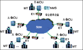 多點(diǎn)視頻會(huì)議系統(tǒng)主要由視聽多媒體會(huì)議終端MT、通信傳輸網(wǎng)絡(luò)SDH、網(wǎng)絡(luò)節(jié)點(diǎn)的多點(diǎn)控制單元MCU、網(wǎng)絡(luò)管理系統(tǒng)NMS以及外圍設(shè)備等幾部分組成。由于通信網(wǎng)絡(luò)不同,會(huì)議電視系統(tǒng)的終端和多點(diǎn)控制單元MCU也不盡相同。例如,對(duì)于采用電路交換通信網(wǎng)絡(luò)的多點(diǎn)會(huì)議系統(tǒng)通過(guò)MCU實(shí)現(xiàn),而包交換通信網(wǎng)絡(luò)則通過(guò)多點(diǎn)會(huì)議服務(wù)器來(lái)實(shí)現(xiàn)多方會(huì)議。如圖: