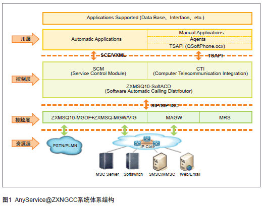 中興通訊AnyService@ZXNGCC多媒體統(tǒng)一接觸中心系統(tǒng)以中興通訊ZXMSQ10多媒體軟排隊(duì)機(jī)系統(tǒng)為基礎(chǔ),基于軟交換技術(shù)。ZXMSQ10由接入網(wǎng)關(guān)和軟排隊(duì)機(jī)兩個(gè)核心部件組成,語(yǔ)音、視頻呼叫(呼入和呼出)通過(guò)ZXMSQ10多媒體軟排隊(duì)機(jī)匯聚到AnyService@ZXNGCC系統(tǒng),其他媒體通過(guò)MAGW接入到NGCC系統(tǒng),同時(shí)AnyService@ZXNGCC也選擇最佳的媒體類(lèi)型將信息主動(dòng)反饋給用戶(hù),形成雙向溝通的渠道,實(shí)現(xiàn)呼叫中心系統(tǒng)的被動(dòng)服務(wù)和主動(dòng)服務(wù)。