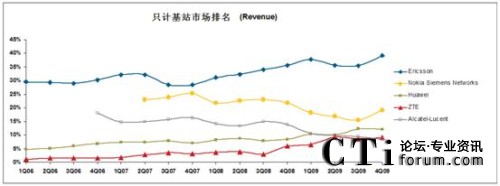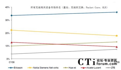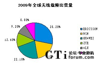 CTI論壇(ctiforum)4月16日消息(記者 潘婷婷): 近日,業(yè)內(nèi)著名調(diào)研公司Infonetics發(fā)布了2009年全球無(wú)線通信設(shè)備市場(chǎng)研究報(bào)告《2G/3G Mobile Infrastructure and Subscribers》。根據(jù)報(bào)告顯示,2009年全年,全球無(wú)線通信市場(chǎng)份額出現(xiàn)了較大變化,按載頻計(jì),中興通訊全年以12.6%的全球市場(chǎng)份額超越阿爾卡特-朗訊,居行業(yè)第4,按載頻計(jì),2009年全球無(wú)線設(shè)備出貨市場(chǎng)份額排名為愛(ài)立信、華為、諾基亞-西門(mén)子、中興、阿爾卡特-朗訊,分別為28.2%,22.1%,19%,12.6%和9.2%。
