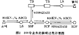 --用戶在撥打800號業(yè)務(wù)用戶號碼時,首先由網(wǎng)絡(luò)點上的普通電話交換機接收,并把800KN1N2ABCD號碼經(jīng)話路傳送給業(yè)務(wù)交換點SSP,再由SSP將此號碼經(jīng)No.7信令鏈路送到業(yè)務(wù)控制點SCP,SCP通過在業(yè)務(wù)數(shù)據(jù)庫SDP中查尋譯碼表將此號碼翻譯成普通的電話號碼回送SSP,最后由SSP負(fù)責(zé)完成電路的連接,該過程如圖2所示。