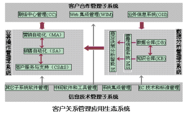 4. 信息技術(shù)管理子系統(tǒng):為CRM各模塊和子系統(tǒng)運行提供技術(shù)設(shè)備保障,內(nèi)容包括其他子系統(tǒng)軟件管理、中間軟件和工具管理、系統(tǒng)集成管理和電子商務技術(shù)和標準管理等。