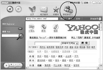 MSN瀏覽器除了靚麗的界面,更集郵件和即時通訊功能為一身,注意圖中圈住的地方,就是與即時通訊軟件MSN的有機結合