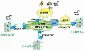 VPN中,實(shí)現(xiàn)業(yè)務(wù)在VLAN 和VPN中的無縫對接,以保證用戶數(shù)據(jù)的安全、高效傳輸;接入網(wǎng)采用基于RPR或SDH的MSPP環(huán)實(shí)現(xiàn)IP業(yè)務(wù)和TDM業(yè)務(wù)的綜合傳輸;在商業(yè)樓宇內(nèi)主要采用IAD設(shè)備將客戶的數(shù)據(jù)、語音、專線等業(yè)務(wù)接入CNC