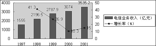 過去幾年是我國電信業(yè)大發(fā)展時期,電信收入平均每年增長約23%。電話用戶總數(shù)與移動電話總數(shù)迅速增長,并在2001年超過美國,躍居世界第一。但是,過去的高增長并不必然帶來明天的高增長,在2000年和2001年,我國電信收入已經(jīng)呈現(xiàn)出稍高于GDP的中速增長態(tài)勢。