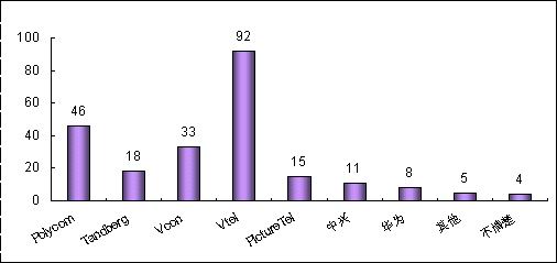 各品牌的認(rèn)知度與其市場(chǎng)銷售情況息息相關(guān)。例如,VTEL是最早進(jìn)入中國(guó)市場(chǎng)的視頻會(huì)議廠商,并在相當(dāng)長(zhǎng)的時(shí)期內(nèi)占據(jù)市場(chǎng)領(lǐng)先地位,取得顯著的品牌認(rèn)知度是有其廣泛用戶基礎(chǔ)作為支撐的;POLYCOM雖然從1998年才開(kāi)始進(jìn)軍中國(guó)市場(chǎng),但在基于IP的視頻會(huì)議系統(tǒng)的市場(chǎng)爭(zhēng)奪中取得較好的成績(jī);PictureTel已經(jīng)被POLYCOM收購(gòu),品牌認(rèn)知度也相對(duì)較低;而國(guó)內(nèi)品牌中興、華為剛剛起步,也很難達(dá)到較高的認(rèn)知度。