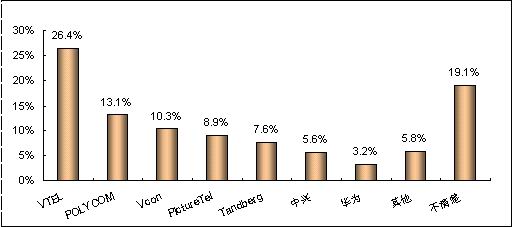 在無(wú)提示情況下,被調(diào)查者首先想到的視頻會(huì)議終端系統(tǒng)的品牌分布情況,即品牌第一提及率指標(biāo),可以反映出各品牌被用戶認(rèn)知的廣泛程度。賽迪顧問(wèn)調(diào)查數(shù)據(jù)顯示,第一提及率最高的品牌是VTEL,支持率達(dá)到26.4%,比處于第二位的品牌高出13.3個(gè)百分點(diǎn);其次是POLYCOM和Vcon,支持率達(dá)到13.1%和10.3%。(見(jiàn)圖5)