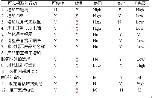 項(xiàng)目小組接下來對列舉的眾多原因合并、歸類并再次進(jìn)行頭腦風(fēng)暴,并"可控性"、"實(shí)施預(yù)期效果"、"實(shí)施費(fèi)用"、"是否可以由項(xiàng)目小組作決定"、"優(yōu)先級"等幾個方面對可以采取的行動進(jìn)行逐項(xiàng)分析(見下圖),最終確定1、5、9、10、11、12項(xiàng)納入到實(shí)施方案,指定相應(yīng)的實(shí)施負(fù)責(zé)人,制定相應(yīng)實(shí)施時間表,實(shí)施時長為三個月。