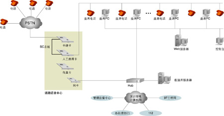 系統(tǒng)的核心是話路語音中心,主要實現(xiàn)兩大功能: 一是實現(xiàn)180系統(tǒng)的話路語音平臺; 二是實現(xiàn)與電話網(wǎng)絡(luò)的接口。以1臺Pentium級工控機作為處理平臺,2塊30線數(shù)字中繼語音處理卡,1塊帶振鈴器的24線模擬座席電話轉(zhuǎn)接卡,1塊4路傳真卡,卡間以語音處理行業(yè)的標(biāo)準(zhǔn)總線SC總線相連。系統(tǒng)與電信網(wǎng)絡(luò)的接口采用E1數(shù)字中繼線,信令方式采用中國一號信令為隨路信令,工控機用TCP/IP協(xié)議與局域網(wǎng)相連。