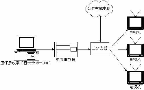 本系統(tǒng)接收端接收實時廣播時,除了用普通PC機收看,或把PC機接收到的信號輸?shù)诫娨暎ù笃粒┥鲜湛矗踔吝可以接入有線電視網(wǎng)進行播放。具體方法是通過一個接收端接收股評節(jié)目,通過帶TV-OUT的顯卡把TV信號輸出到中頻調(diào)制設(shè)備,中頻調(diào)制設(shè)備可以把基帶模擬信號轉(zhuǎn)換成一個有線電視信號,且傳輸距離遠,損失小,再把這個信號與有線電視信號一起接入一個二分支器(2進1出),這就可以和公共有線電視共存,形成自己的頻道,供電視接收。