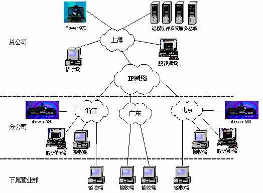 某證券公司有三級網(wǎng)絡,總公司、分公司和下屬營業(yè)部。總公司到分公司帶寬是2M,在總公司配置一套會議室型電視會議終端POLYCOM 970和一套多點會議服務器Radvision ViaIP400。在分公司配置了38套會議室型電視會議終端POLYCOM 680,用于與總公司進行雙向視頻會議。分公司到營業(yè)部帶寬是512K,各營業(yè)部安裝遠程股評系統(tǒng)接收端程序,遠程股評系統(tǒng)服務器都放置在海通總公司。當在總公司進行股評時,總公司本地攝像頭拍攝教師畫面,MIC采集教師聲音,傳給服務器編碼,再通過網(wǎng)絡供各個接收端接收;當在分公司進行股評時,首先分公司的電視會議設(shè)備采集教師畫面及聲音傳回總公司的電視會議設(shè)備,再傳給遠程股評系統(tǒng)的服務器進行編碼,然后通過網(wǎng)絡發(fā)布,供接收端接收。(結(jié)構(gòu)如下圖)