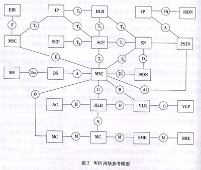 在基于CDMA的無線智能網(wǎng)方面,北美的TIA/EIA組織頒布了基于CS-2的無線智能網(wǎng)規(guī)范WIN。WIN分為三個階段:階段一、預付費階段和階段二。其中階段一支持的主要業(yè)務有來話篩選業(yè)務,主叫名字顯示業(yè)務和語音控制的業(yè)務,預付費階段主要支持預付費業(yè)務,階段二支持被叫集中付費,立即付費等五種業(yè)務。WIN網(wǎng)絡參考模型如圖2所示。
