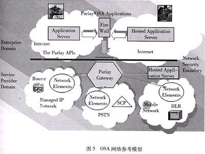 為了克服傳統(tǒng)智能網(wǎng)的上述不足,開放業(yè)務體系結構(OSA,Open Service Architecture)應運而生。如圖5所示,OSA是一種全新的業(yè)務體系結構,主要包括底層通信網(wǎng)絡,高層的應用服務器(Application