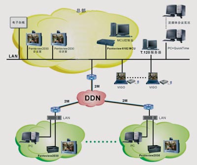 以構(gòu)建一個二級視頻網(wǎng)絡(luò)為例,整個視頻會議系統(tǒng)采用星型拓?fù)溥B接,采用兩級組網(wǎng),兩級間通過DDN網(wǎng)絡(luò)相互連通,中心點(diǎn)為一級網(wǎng),分部為第二級網(wǎng)。中心點(diǎn)由一套Penteview6100系列 MCU和幾套Penteview2030終端組網(wǎng),在其他異地的分部各放置一套Penteview 2030,各異地分部通過DDN專線劃出768K~2M的帶寬進(jìn)行視頻會議,從而組建起一個在1.5M左右的帶寬下獲得高清晰圖像的多點(diǎn)會議電視系統(tǒng)。
