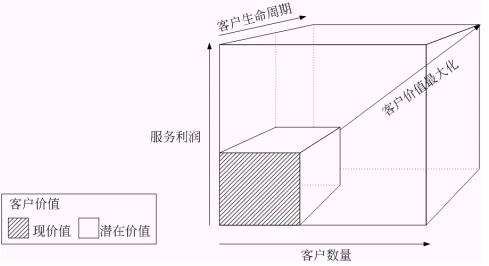 圖二 : 客戶價(jià)值與客戶數(shù)量、服務(wù)利潤和客戶生命周期的關(guān)系