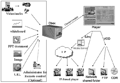通過(guò)Cbox系統(tǒng),稅務(wù)局培訓(xùn)中心的講師只需預(yù)先將各種PowerPoint和圖片文件提供給Cbox,然后按照正常進(jìn)度進(jìn)行教學(xué)。Cbox可以自動(dòng)將攝像頭和麥克風(fēng)采集的講師的音視頻信號(hào)、白板信號(hào)、PowerPoint文檔前進(jìn)、后退、圖片和Internet資源URL進(jìn)行精確同步,制作出包含多種格式數(shù)據(jù)的數(shù)據(jù)流,然后以直播或點(diǎn)播的方式發(fā)布。用戶可以在自己的PC終端上通過(guò)IE瀏覽器同步觀看直播內(nèi)容,或者通過(guò)下載LAN共享目錄、FTP上的文件來(lái)觀看教學(xué)內(nèi)容。如果沒(méi)有網(wǎng)絡(luò)環(huán)境,還可以通過(guò)刻錄光盤(pán)后分發(fā)將培訓(xùn)內(nèi)容傳遞。而且因?yàn)橹恍鑇indows媒體播放機(jī)和IE瀏覽器就可正常播放,所以可以降低客戶端軟件安裝調(diào)試的工作量和費(fèi)用。系統(tǒng)中還有可供選擇的助教,他只需使用普通PC和IE瀏覽器,在講師不方便控制PowerPoint文檔等內(nèi)容的情況下,幫助講師完成相應(yīng)操作。另外一個(gè)可選的流媒體服務(wù)器,是用來(lái)支持大量用戶同時(shí)直播、點(diǎn)播需求。