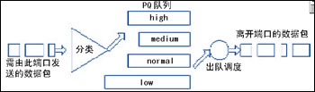 為了實(shí)現(xiàn)QoS,需要改變傳統(tǒng)IP網(wǎng)絡(luò)的FIFO隊(duì)列傳輸報文機(jī)制,轉(zhuǎn)而采用優(yōu)先級隊(duì)列(Priority Queueing, PQ)機(jī)制,見圖2。