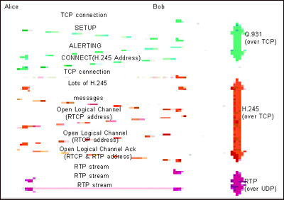 然后,Bob和Alice在此連接上發(fā)送Q.931包。,在這些交換的數(shù)據(jù)包中,Bob和Alice發(fā)送動(dòng)態(tài)的端口用于建立H.245連接(即上圖CONNECT數(shù)據(jù)包中的H.245 Address)。