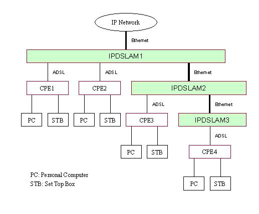 目前國內(nèi)運(yùn)營商主要經(jīng)營IP網(wǎng)絡(luò),而IP設(shè)備比較ATM設(shè)備便宜,因此DSLAM以IP方式上連將是ADSL的發(fā)展趨勢,目前ADSL的擴(kuò)容也主要以IPDSLAM為主,因此本文以IPDSLAM為例介紹Video over IP方案。 IPDSLAM設(shè)備組網(wǎng)時(shí)可以級(jí)連,其網(wǎng)絡(luò)拓?fù)淙鐖D1所示。