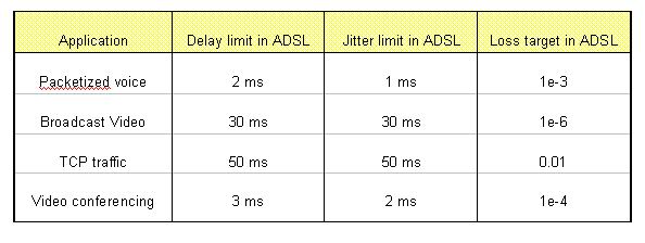 本節(jié)以ADSL承載的幾種典型業(yè)務(wù)為例,討論如何保證不同應(yīng)用的QoS要求。為保證不同應(yīng)用的QoS要求,ADSL設(shè)備可通過對不同的業(yè)務(wù)進(jìn)行分級(jí),以Diffserv的方式提供不同的分級(jí)所需的QoS質(zhì)量。例如可將語音業(yè)務(wù)(VoIP)和視頻會(huì)議設(shè)為最高優(yōu)先級(jí),廣播視頻業(yè)務(wù)設(shè)為較高優(yōu)先級(jí),其他如Web瀏覽等業(yè)務(wù)設(shè)為低優(yōu)先級(jí)。ADSL設(shè)備為每個(gè)優(yōu)先級(jí)設(shè)立獨(dú)立的隊(duì)列,然后采用嚴(yán)格優(yōu)先級(jí)或帶有權(quán)重的循環(huán)機(jī)制控制各優(yōu)先級(jí)隊(duì)列的輸出。通過調(diào)整不同優(yōu)先級(jí)隊(duì)列的buffer大小和最長留駐時(shí)間,可滿足不同應(yīng)用對時(shí)延、抖動(dòng)、包丟失率的不同要求。
