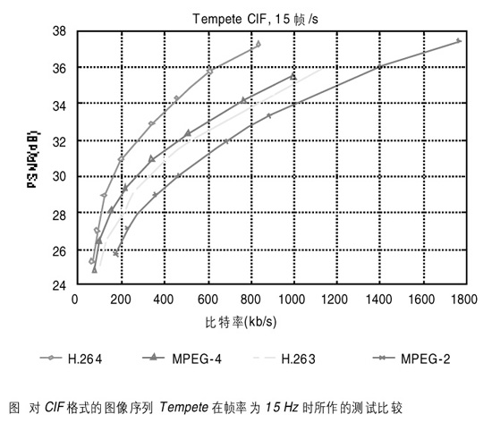 為了闡述H.264的編碼效率,我們將其與其它標準如MPEG-2、H.263、MPEG-4等作比較。使用QCIF、CIF格式的圖像序列作測試,所有編碼器都使用拉格朗日優(yōu)化技術(shù)。我們使用H.264的測試軟件JM2.0并使用了Main Profile的主要技術(shù)特征。對H.263和H.264采用的參考幀數(shù)為5,只編碼圖像序列的第一幀為I幀,每2個參考幀P之間插入2個非參考幀B。使用全搜索方式進行32×32整數(shù)范圍的運動估計,且由預(yù)先設(shè)定的量化參數(shù)來進行比特率的調(diào)整。圖為對CIF格式的圖像序列Tempete在幀率為15Hz時所作的測試比較。