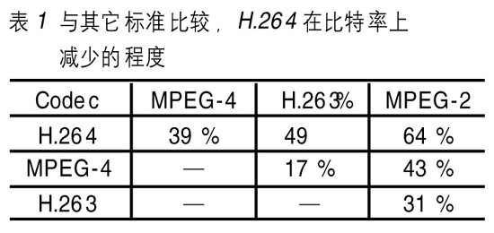 和其它標準比較,H.264在比特率上減少的程度如表1所示。