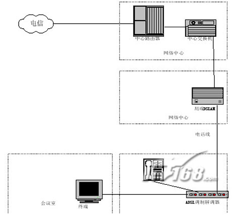 通過V.35接口接入到用戶網(wǎng)絡中的路由器上,電信網(wǎng)絡中心的MODEM則通過V.35接口接入到電信網(wǎng)絡的路由器上,連接速率從64Kbps-2Mbps可選,可以滿足視頻會議的接入要求。