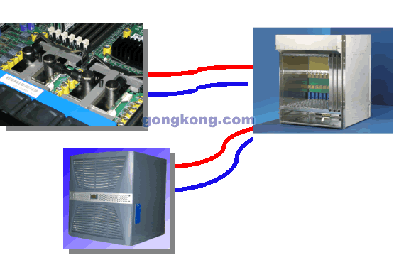 散熱原理: 由工業(yè)空調(diào)提供冷卻循環(huán)水,板卡上的“熱點(diǎn)”安裝液體散熱片,散熱片通過(guò)循環(huán)管道以及特殊連接器與背板連接,背板上由特殊連接器通過(guò)循環(huán)管道與工業(yè)空調(diào)的循環(huán)系統(tǒng)相連。板卡可以正常插拔,不會(huì)牽連循環(huán)管道。