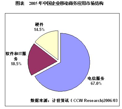目前,我國移動商務(wù)市場仍處于萌芽期,根據(jù)計世資訊(CCW Research)《2005-2006中國移動商務(wù)應(yīng)用發(fā)展趨勢研究報告》數(shù)據(jù),2005年中國企業(yè)移動商務(wù)應(yīng)用市場規(guī)模為112.5億元,其中硬件投資為16.3億元,軟件與IT服務(wù)投資為20.8億元,電信服務(wù)投資達到75.4億元,占有整體市場的67.0%。