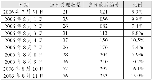 《通告》規(guī)定,擬在第一階段調(diào)整的SP代碼主要是已經(jīng)基礎(chǔ)運(yùn)營商分配并已開通、且希望原代碼后4位與新代碼后4位保持一致的。在《通告》規(guī)定的提交申請(qǐng)有效時(shí)間內(nèi)(2006年7月31日8時(shí)至2006年8月11日17時(shí)),信息產(chǎn)業(yè)部共受理符合《通告》要求的代碼調(diào)整申請(qǐng)353份(有關(guān)信息詳見附表1),共涉及申請(qǐng)單位353家、擬申請(qǐng)SP代碼344個(gè)。
