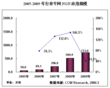 在運(yùn)營商N(yùn)GN建設(shè)高速增長的同時,政府、能源、交通等行業(yè)專網(wǎng)NGN建設(shè)也逐漸步入快車道。NGN在行業(yè)專網(wǎng)的應(yīng)用,到2005年底的應(yīng)用規(guī)模達(dá)到50萬線,根據(jù)計(jì)世資訊(CCW Research)《2005-2006中國NGN產(chǎn)業(yè)應(yīng)用趨勢研究報告》的預(yù)測,未來4年,NGN在行業(yè)專網(wǎng)市場將以95%的復(fù)合增長率高速增長。