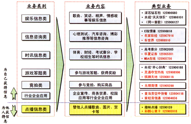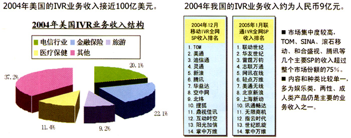 目前,國內IVR的業(yè)務主要集中于為個人提供服務上,行業(yè)應用所占比例較小,與成熟的國外市場以行業(yè)應用為主的現(xiàn)狀形成巨大反差。而且,在為個人提供的語音業(yè)務中,國內最受歡迎的仍是娛樂信息類中的聊天交友類業(yè)務,這表明國內個人用戶的需求層次較低;其次是娛樂和點播類的音樂類業(yè)務;第三大類是游戲答題類,例如:知識競猜、有獎競猜、角色扮演游戲、互動游戲等;另外,IVR的數(shù)據(jù)業(yè)務,如:短信、彩鈴、彩信等,受到近兩年國內短信、彩鈴業(yè)務蓬勃發(fā)展的帶動,近兩年也呈現(xiàn)快速增長的良好勢頭。