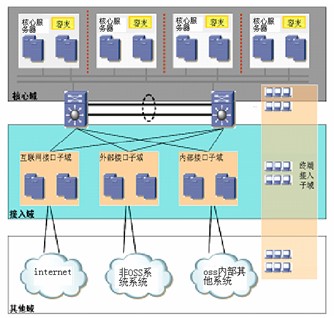 OSS管理者在保證及時準確的提供信息服務(wù)的基礎(chǔ)上,應(yīng)該按不同的安全級別研究對安全域進行劃分,確認那些為核心子域,那些為接入域,那些為其他域。通過對不同的安全域進行不同的安全策略劃分,保證如上的安全域所享受的安全級別是不同的。圖1顯示,核心域、接入域和其他域是第次接入的,向下訪問可以透明傳輸,而向上的訪問就必須設(shè)定相應(yīng)的訪問控制。