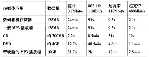 2.0接口相當(dāng),遠(yuǎn)遠(yuǎn)高于無線局域網(wǎng)802.11b的11 Mbit/s,也比下一代無線局域網(wǎng)802.11a/g的54 Mbit/s高出近一個(gè)數(shù)量級(jí)。UWB通信的功耗較低,能更好地滿足使用電池的移動(dòng)設(shè)備的要求。另外,UWB信號(hào)的功率譜密度非常低,信號(hào)難以被檢測(cè)到,再加上采用的跳頻、直接序列擴(kuò)頻等擴(kuò)頻多址技術(shù),使非授權(quán)者很難截獲傳輸?shù)男畔ⅲ蚨踩苑浅:。?是一些典型的實(shí)時(shí)多媒體應(yīng)用對(duì)不同無線傳輸技術(shù)的數(shù)據(jù)傳輸速率的要求。從表中可以看出,如果采用無線的方式來進(jìn)行傳輸,只有UWB技術(shù)可以滿足各種應(yīng)用的要求。