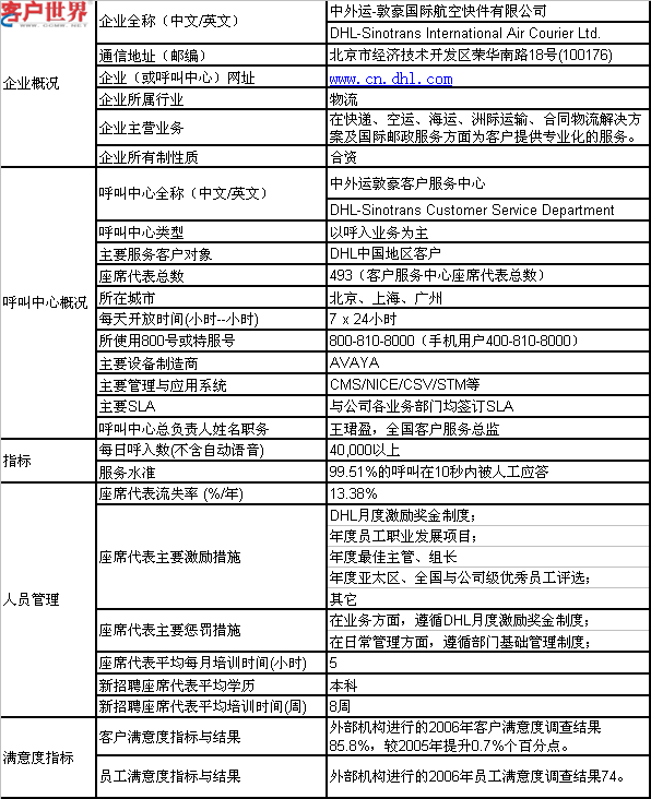中外運(yùn)敦豪客戶服務(wù)中心現(xiàn)主要負(fù)責(zé)DHL中國客戶呼入業(yè)務(wù),公司在北京(北方區(qū))、上海(東方區(qū))、廣州(南方區(qū))分別設(shè)立區(qū)域級呼叫中心,采用全國免費(fèi)客戶服務(wù)熱線800-810-8000接入,并使用400-810-8000為手機(jī)用戶提供服務(wù)。除了電話,還開通多種客戶溝通和聯(lián)絡(luò)渠道。在運(yùn)營方面執(zhí)行嚴(yán)格的行業(yè)質(zhì)量標(biāo)準(zhǔn)體系,在預(yù)定取件、服務(wù)咨詢、跟蹤查詢、服務(wù)補(bǔ)救、重要客戶支持、電子商務(wù)受理過程中精益求精,為客戶提供全天候、一站式、個(gè)性化的信息、數(shù)據(jù)和客戶服務(wù),與客戶建立長期的伙伴關(guān)系。