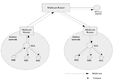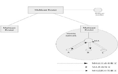 IETF的移動IP協(xié)議定義了家鄉(xiāng)代理(home Agent,簡稱HA)、外地鏈路、外地代理(foreign Agent,簡稱FA)、通信對端等概念,一個移動節(jié)點擁有兩個IP地址:家鄉(xiāng)地址和轉(zhuǎn)交地址。節(jié)點在移動過程中,家鄉(xiāng)地址不改變,發(fā)送到該節(jié)點的數(shù)據(jù)都通過家鄉(xiāng)地址與轉(zhuǎn)交地址之間的隧道轉(zhuǎn)發(fā)給移動節(jié)點。當組成員切換時,包括網(wǎng)絡(luò)鏈路間切換的固有時延,以及重新加入組播組以及建立組播轉(zhuǎn)發(fā)樹的時延,都將導致組播成員丟包。
