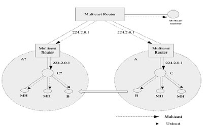 在極端的情況下,網(wǎng)絡(luò)A中組播組224.2.0.1只有C一個組播成員且網(wǎng)絡(luò)A中后來也無其他MH加入組播組224.2.0.1,C將通知上游路由器退出組播組224.2.0.1,這時候需要重新構(gòu)建組播樹;而在網(wǎng)絡(luò)A′中,原來也沒有組播組224.2.0.1的組成員,當B要求加入組播組224.2.0.1時,網(wǎng)絡(luò)A′中的組播代理C′需要向上游網(wǎng)絡(luò)路由器發(fā)送加入組播組224.2.0.1的請求,然后向B轉(zhuǎn)發(fā)該組的組播數(shù)據(jù)包,這時的切換有可能因為切換時延而導致組播數(shù)據(jù)包丟失。