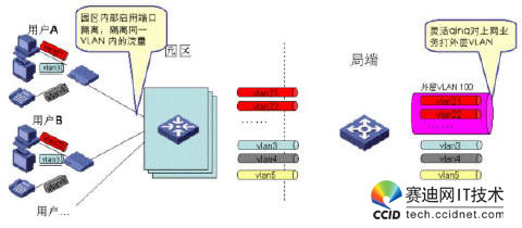 考慮到業(yè)務特性,上網(wǎng)業(yè)務通常需要對用戶進行精細化管理,而對IPTV業(yè)務通常采用較粗獷的管理模式,因此我們建議通過如下方式來做VLAN規(guī)劃:對上網(wǎng)業(yè)務,采用PUPV(每用戶一VLAN),對于IPTV/VOIP業(yè)務,采用PSPV(每業(yè)務一VLAN),即同一園區(qū)內(nèi)的IPTV用戶采用同一VLAN,不同園區(qū)的IPTV/VOIP用戶采用不同的業(yè)務VLAN,在局端,通過靈活QINQ對上網(wǎng)業(yè)務的VLAN打外層標簽,對于IPTV業(yè)務的VLAN不打外層標簽。