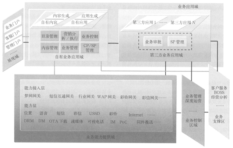 。1)業(yè)務(wù)能力系統(tǒng)。該部分包括具有實現(xiàn)各應(yīng)用功能的能力提供系統(tǒng),如短信、WAP等,可提供用戶使用業(yè)務(wù)功能的實現(xiàn)通道。