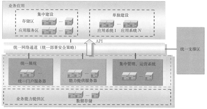 (6)統(tǒng)一展示區(qū):搭建統(tǒng)一門戶,并采用用戶信息統(tǒng)一管理,用戶登陸一次鑒權(quán)機制,以提供用戶多業(yè)務(wù)統(tǒng)一登陸通道,及一次登陸方式,實現(xiàn)業(yè)務(wù)統(tǒng)一展示、管理,減小多業(yè)務(wù)給用戶帶來的感知度。各區(qū)域可分別構(gòu)造統(tǒng)一數(shù)據(jù)存儲系統(tǒng)和統(tǒng)一應(yīng)用系統(tǒng),具體建設(shè)時可在物理位置上統(tǒng)一部署。