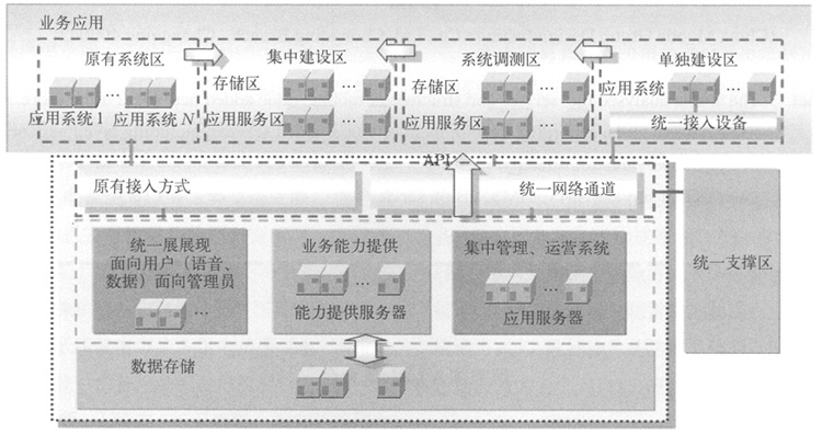 。5)應(yīng)用業(yè)務(wù)區(qū):統(tǒng)一搭建應(yīng)用硬件平臺,實現(xiàn)應(yīng)用業(yè)務(wù)區(qū)業(yè)務(wù)應(yīng)用及業(yè)務(wù)能力提供區(qū)接入通道類型的新增,均可直接在其硬件平臺上加載應(yīng)用軟件、提供服務(wù),調(diào)用現(xiàn)有資源實現(xiàn)。個別因為系統(tǒng)本身需求需要單獨建設(shè)、部署的系統(tǒng)則保留其單獨建設(shè)的方式。