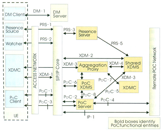 PoC業(yè)務(wù)需要外部實體配合提供,包括SIP/IP核心、共享XML文檔管理服務(wù)器(共享XDMS)、匯聚代理、在席服務(wù)器、在席信息源、觀察者、計費實體和設(shè)備管理等,其中主要有:
