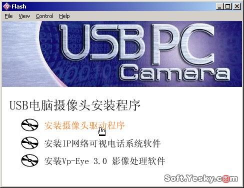 首先在光驅(qū)中放入攝像頭自帶的驅(qū)動光盤,光盤自動運行后會出現(xiàn)如圖1所示的功能菜單(假如光盤自動運行被禁用,也可以直接進入光盤盤符雙擊install、exe程序),擇“安裝攝像頭驅(qū)動程序”。