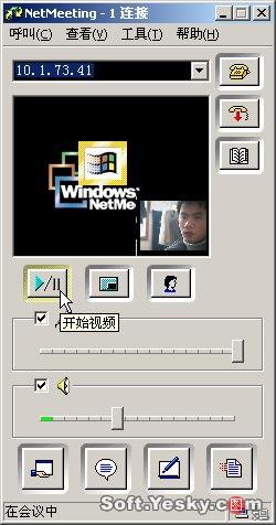 在NetMeeting中使用視頻功能很簡單,只需要單擊主界面的中的“開始視頻”按鈕,即可發(fā)送視頻流,在視頻按鈕右側(cè)還有兩個按鈕,分別用于切換畫中畫效果和調(diào)節(jié)音量,如圖10所示。
