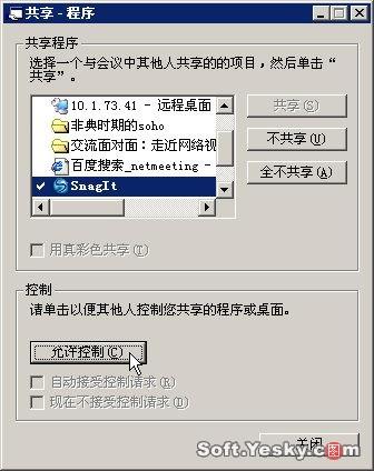 使用“共享”功能的方法是單擊“共享”按鈕,然后在共享程序窗口選擇需要共享的程度或軟件并單擊“答應(yīng)控制”按鈕,如圖11。