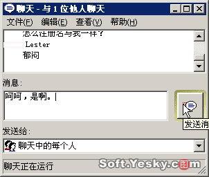 單擊“聊天”按鈕,Netmeeting會彈出一個聊天對話框,你可以對所有或是某一與會者發(fā)送聊天信息,如圖12所示。
