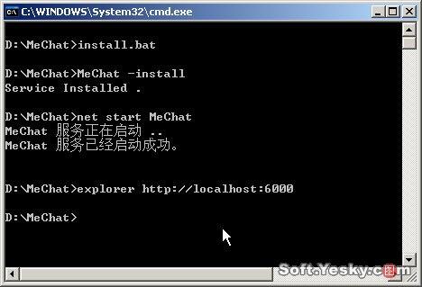 說明:MeChat目錄中還有一個Run、bat,該文件用于測試MeChat服務(wù)器。假如安裝MeChat時Run、bat的命令窗口還開著,則務(wù)必先關(guān)閉此窗口再執(zhí)行install、bat。另外,雙擊執(zhí)行該目錄下的uninstall、bat批處理文件可以停止并刪除系統(tǒng)中的MeChat服務(wù)。